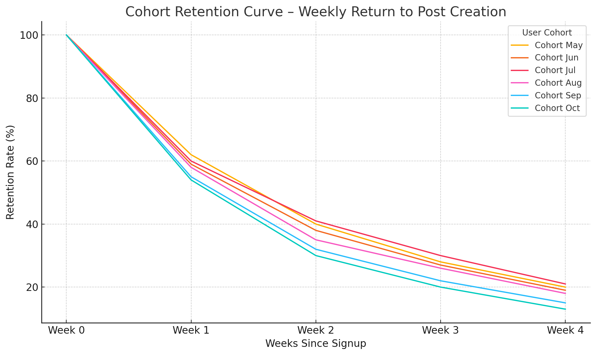 Weekly Retention of New Creators (Cohort Analysis): This cohort retention chart tracks the percentage of users who returned to create content in the weeks following their signup. Each line represents a monthly cohort from May to October.